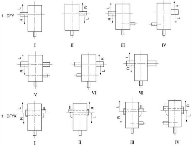 按輸出軸分,DFY可分為I、II、III、Ⅳ、V、Ⅵ、Ⅶ七種裝配型式,DFYK可分為I、II、III、Ⅳ四種裝配型式。如需配逆止器時請注明(一般為自配)。