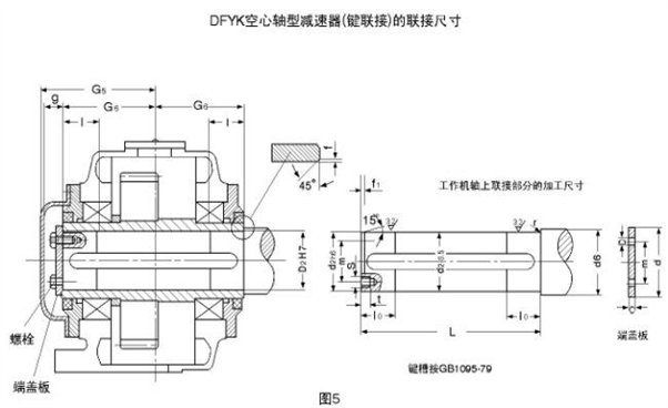 3.DFYK減速器空心軸用鍵聯(lián)接的連接尺寸見圖5、表15;
